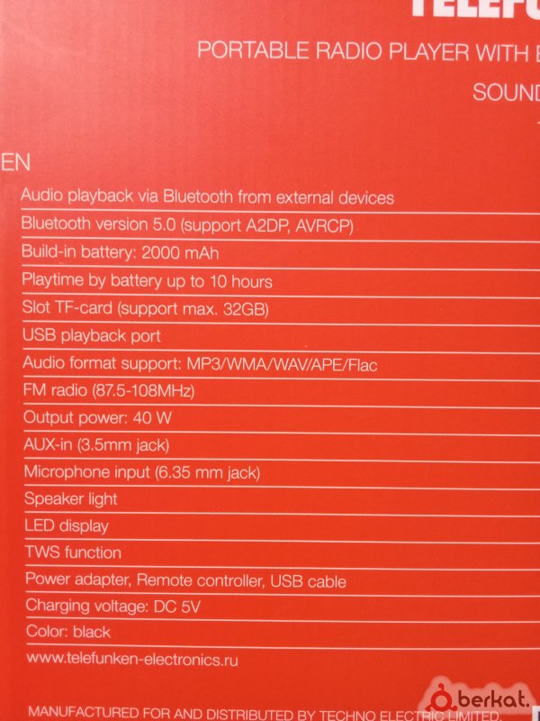 Новая магнитола в упаковке,от немецкой фирмы Телефункен.Размер не маленький,приличный.Радио,флешка,блютуз,Аукс,Цветомузыка,эквалайзер и т.д.Мощность звука 20+20=40ватт чистейшего качественного стерео звука.Работает как от сети,так и встроенного аккумулятора,зарядки хватает на долго.Можно брать и на природу.Классная вещь.