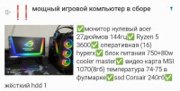 Пoлный комплект- только собран - новый большой IPS Moнитор 27" 200Гц + клaвиатуpa + мышкa + мощный компьютер Intel 10400f 6 ядер 12 потоков макс. частота 4.3 ГГц - Кулер с тепловыми трубками и подсветкой - Холодная надежная Видеокарта GTX1070 8GB (мощнее чем GTX1660Super) - Оперативная память 16 GB - Два жестких диска - SSD M2 NVME диск 500GB с радиатором охлаждения и HDD диск 500GB - Блок питания - 650 Watt - Красивый хорошо продуваемый корпус- закаленное стекло сбоку + кулер c подсветкой - Установлена Windows 10 pro, программы для интернета и фильмов. ------Также можно добавить за доплату новые наушники с микрофоном и новый быстрый 300Mbps Wi-Fi адаптер для интернета