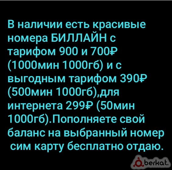 Продаю красивые номера Билайн 1000г интернет безлимитные звонки на Билайн на другие 500мин цена 1000₽ с оформоением. Писать на номер: +7-(962)-895-06-06