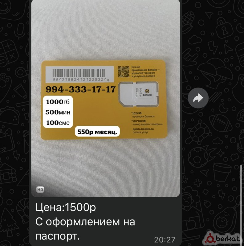 Продаю Сим-карты Билайн Безлимит тариф 350р месяц, Безлимитные звонки на Билайн, на другие 1000мин, Месенжеры социальные сети,видео бесплатно, Интернет 1000г, Активация через Госуслуги или через ваш номер Билайн ( занимает 5 мин максимум все объясню). Цена 500р (можно выбрать номер на свой выбор). Кому надо сделаю e-sim Номер для связи 8964-854-78-20.